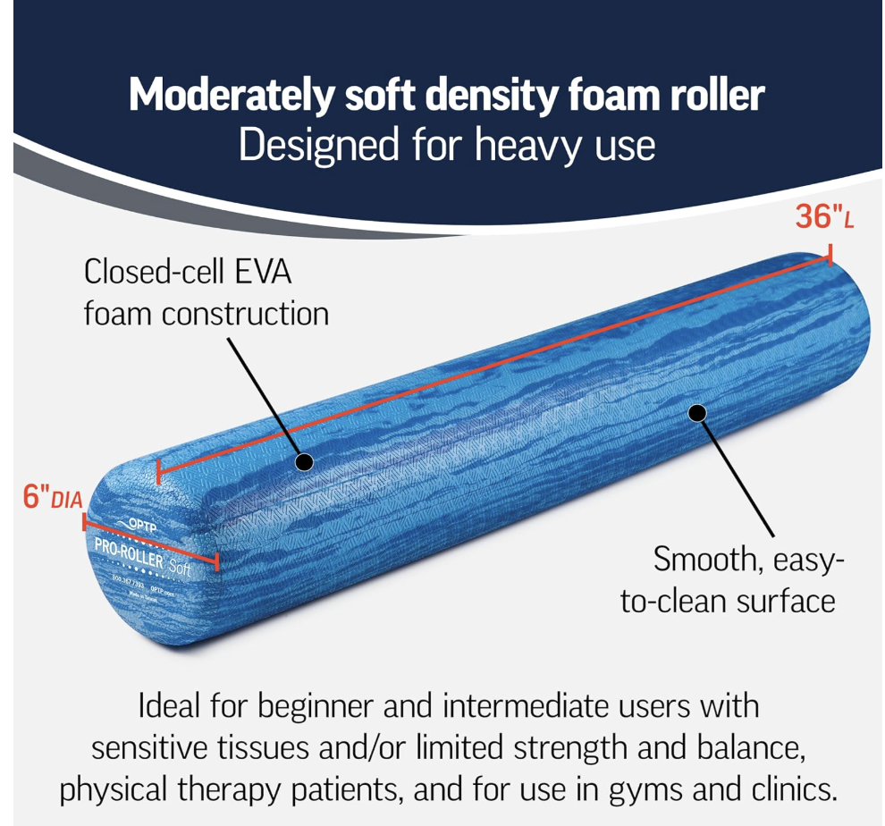 OPTP PRO-Roller Soft Density Foam Roller – Low Density Soft Foam Roller for Physical Therapy, Pilates, Yoga Foam Roll Exercises, and Muscle Recovery- Blue 36" x 6"